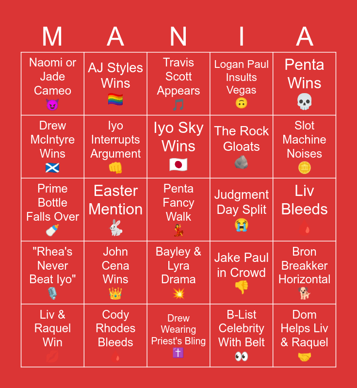 This bingo card has a free space and 24 words: John Cena Wins đ, Cody Rhodes Bleeds đЏ, Iyo Sky Wins đŻđľ, Liv & Raquel Win đ, Penta Wins đ, Naomi or Jade Cameo đ, Drew McIntyre Wins đ´ó §ó ˘ó łó Łó ´ó ż, AJ Styles Wins đłď¸âđ, Judgment Day Split đ, Bayley & Lyra Drama đĽ, The Rock Gloats đި, Prime Bottle Falls Over đź, Jake Paul in Crowd đ, Bron Breakker Horizontal đ, Iyo Interrupts Argument đ, B-List Celebrity With Belt đ, Liv Bleeds đЏ, Travis Scott Appears đľ, Slot Machine Noises đŞ, Easter Mention đ, Dom Helps Liv & Raquel đ¤, "Rhea's Never Beat Iyo" đď¸, Logan Paul Insults Vegas đ and Drew Wearing Priest's Bling âď¸.