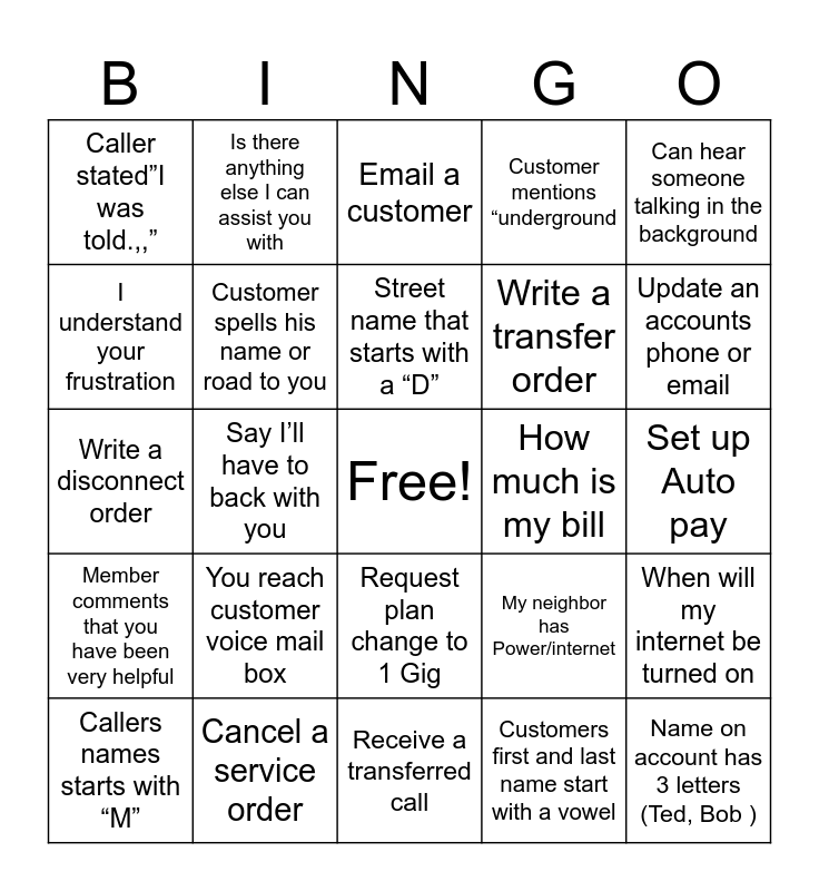 This bingo card has a free space and 25 words: You reach customer voice mail box, Receive a transferred call, Street name that starts with a “D”, Callers names starts with “M”, Can hear someone talking in the background, Caller stated”I was told.,,”, I understand your frustration, Is there anything else I can assist you with, How much is my bill, Request plan change to 1 Gig, Write a transfer order, Write a disconnect order, My neighbor has Power/internet, When will my internet be turned on, Customer spells his name or road to you, Transfer a call to another department, Set up Auto pay, Email a customer, Update an accounts phone or email, Say I’ll have to back with you, Name on account has 3 letters (Ted, Bob ), Cancel a service order, Member comments that you have been very helpful, Customer mentions “underground and Customers first and last name start with a vowel.