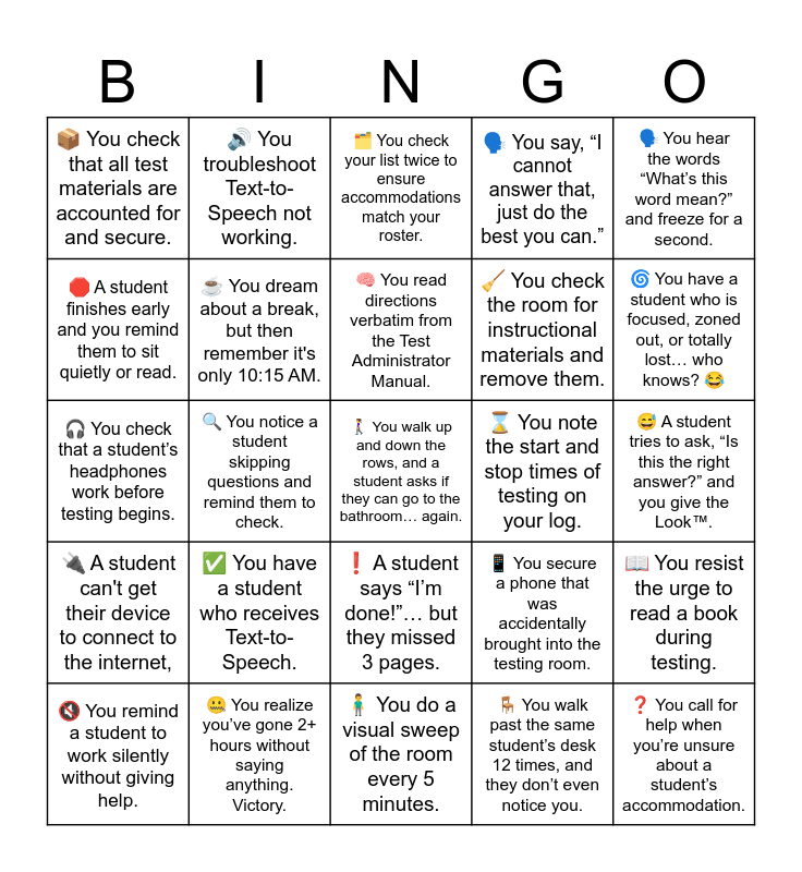 This bingo card has 25 words: β You have a student who receives Text-to-Speech., π§ββοΈ You do a visual sweep of the room every 5 minutes., π§ You read directions verbatim from the Test Administrator Manual., π You remind a student to work silently without giving help., π£οΈ You hear the words βWhatβs this word mean?β and freeze for a second., π¦ You check that all test materials are accounted for and secure., π A student finishes early and you remind them to sit quietly or read., π You troubleshoot Text-to-Speech not working., β You note the start and stop times of testing on your log., β A student says βIβm done!ββ¦ but they missed 3 pages., π§Ή You check the room for instructional materials and remove them., π§ You check that a studentβs headphones work before testing begins., π± You secure a phone that was accidentally brought into the testing room., π You resist the urge to read a book during testing., β You dream about a break, but then remember it's only 10:15 AM., β You call for help when youβre unsure about a studentβs accommodation., π A student tries to ask, βIs this the right answer?β and you give the Lookβ’., ποΈ You check your list twice to ensure accommodations match your roster., π You have a student who is focused, zoned out, or totally lostβ¦ who knows? π, π You notice a student skipping questions and remind them to check., πΆββοΈ You walk up and down the rows, and a student asks if they can go to the bathroomβ¦ again., π€ You realize youβve gone 2+ hours without saying anything. Victory., π A student can't get their device to connect to the internet,, π£οΈ You say, βI cannot answer that, just do the best you can.β and πͺ You walk past the same studentβs desk 12 times, and they donβt even notice you..