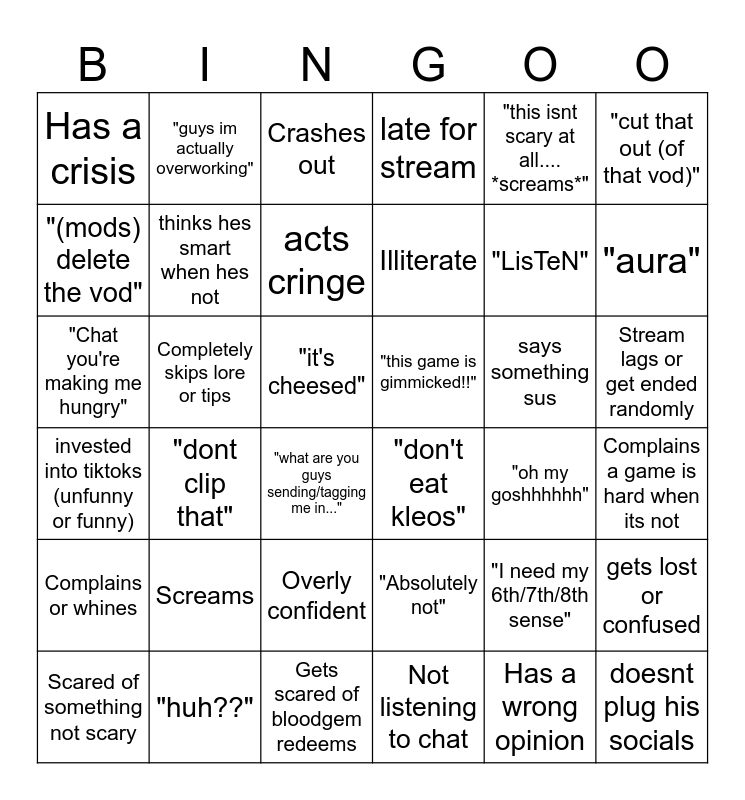 This bingo card has 36 words: "Absolutely not", Overly confident, Not listening to chat, "(mods) delete the vod", invested into tiktoks (unfunny or funny), "this game is gimmicked!!", thinks hes smart when hes not, Gets scared of bloodgem redeems, "this isnt scary at all.... *screams*", "I need my 6th/7th/8th sense", "aura", late for stream, gets lost or confused, Completely skips lore or tips, Illiterate, Has a crisis, Complains or whines, says something sus, "Chat you're making me hungry", Crashes out, "it's cheesed", "dont clip that", "don't eat kleos", "what are you guys sending/tagging me in...", "oh my goshhhhhh", "guys im actually overworking", "LisTeN", "huh??", acts cringe, "cut that out (of that vod)", doesnt plug his socials, Scared of something not scary, Complains a game is hard when its not, Stream lags or get ended randomly, Screams and Has a wrong opinion.