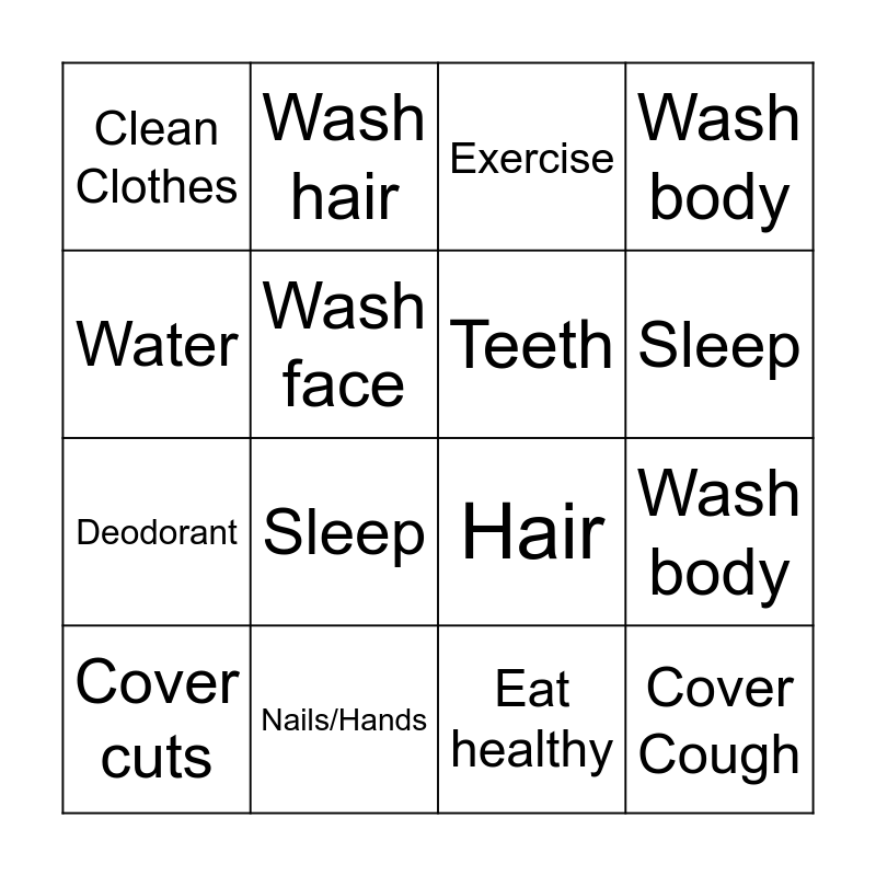 This bingo card has 19 words: Hair, Throw trash away, Exercise, Cover Cough, Wash body, Water, Eat healthy, Clean Clothes, Wash hair, Deodorant, Sleep, Wash face, Teeth, Nails/Hands, Cover cuts, Shave, Wash body, Sleep and Cover cuts.