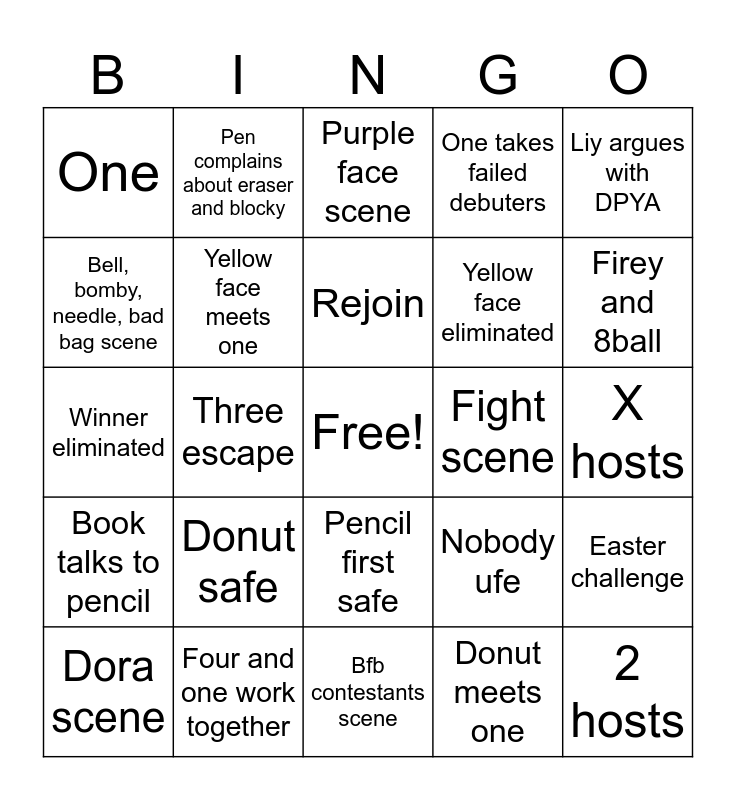 This bingo card has a free space and 24 words: Donut safe, Four and one work together, Rejoin, Dora scene, Liy argues with DPYA, One, Bell, bomby, needle, bad bag scene, Pen complains about eraser and blocky, Fight scene, Pencil first safe, Yellow face eliminated, Winner eliminated, Nobody ufe, Easter challenge, Yellow face meets one, Donut meets one, X hosts, Purple face scene, Firey and 8ball, Three escape, 2 hosts, Book talks to pencil, One takes failed debuters and Bfb contestants scene.