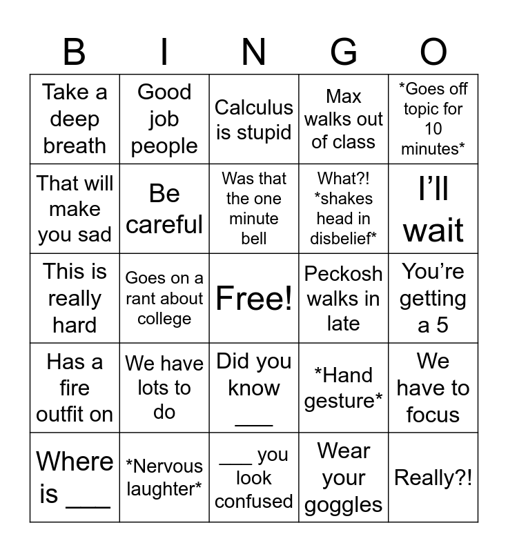 This bingo card has a free space and 25 words: We have lots to do, ___ you look confused, Was that the one minute bell, Where is ___, *Goes off topic for 10 minutes*, Take a deep breath, That will make you sad, Good job people, Peckosh walks in late, Did you know ___, What?! *shakes head in disbelief*, This is really hard, *Hand gesture*, We have to focus, Be careful, Alright lets put our phones away, You’re getting a 5, Calculus is stupid, I’ll wait, Goes on a rant about college, Really?!, *Nervous laughter*, Has a fire outfit on, Max walks out of class and Wear your goggles.
