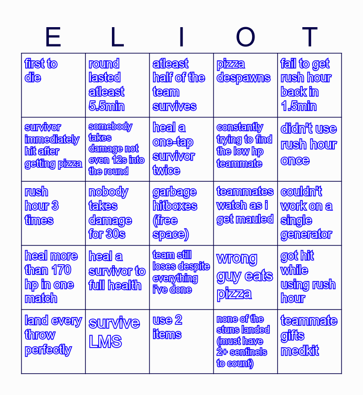 This bingo card has a free space and 35 words: dumbass teammate does something compilation worthy, more than 1/2 of the team are sentinels, didn't get hit once in one match, somebody takes damage not even 12s into the round, team still loses despite everything i've done, pizza despawns, survivor immediately hit after getting pizza, terrible pizza throw, heal a one-tap survivor twice, asking for pizza while being full hp, rush hour 3 times, fail to get rush hour back in 1.5min, survivor dies right as im about to give pizza, chased for 2min straight, first to die, teammates watch as i get mauled, none of the stuns landed (must have 2+ sentinels to count), nobody takes damage for 30s, heal more than 170 hp in one match, teammate gifts medkit, wrong guy eats pizza, land every throw perfectly, got hit while using rush hour, survive LMS, atleast half of the team survives, didn't use rush hour once, everyone else is full hp except me, constantly looking for a medkit, constantly trying to find the low hp teammate, couldn't work on a single generator, maximized Elliot's passive, use 2 items, heal a survivor to full health, round lasted atleast 5.5min and timer feeder / afk survivor.