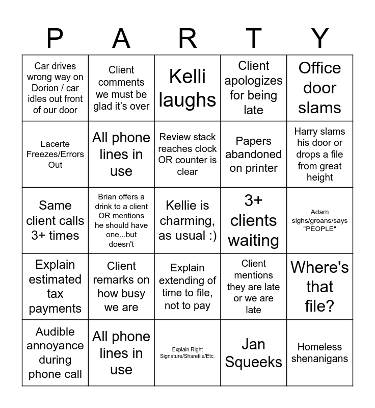 This bingo card has a free space and 24 words: Client remarks on how busy we are, All phone lines in use, Review stack reaches clock OR counter is clear, Audible annoyance during phone call, Office door slams, Car drives wrong way on Dorion / car idles out front of our door, Lacerte Freezes/Errors Out, Client comments we must be glad it’s over, 3+ clients waiting, Explain extending of time to file, not to pay, Papers abandoned on printer, Same client calls 3+ times, Client mentions they are late or we are late, Where's that file?, All phone lines in use, Jan Squeeks, Adam sighs/groans/says "PEOPLE", Kelli laughs, Harry slams his door or drops a file from great height, Brian offers a drink to a client OR mentions he should have one...but doesn't, Homeless shenanigans, Explain estimated tax payments, Client apologizes for being late and Explain Right Signature/Sharefile/Etc..