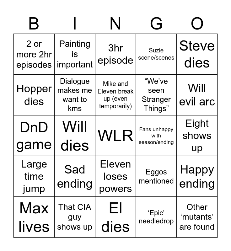 This bingo card has a free space and 31 words: El dies, Will confesses, Will dies, 3 or more MCs die, 2 or more 2hr episodes, 3hr episode, Dialogue makes me want to kms, Eggos mentioned, Fans unhappy with season/ending, ‘Epic’ needledrop, Eight shows up, Other ‘mutants’ are found, 😭, Becomes most watched season on Netflix, Will evil arc, New monster, Happy ending, Sad ending, Large time jump, Eleven loses powers, Steve dies, Time travel is involved in a big way, Max lives, Painting is important, “We’ve seen Stranger Things”, Hopper dies, Suzie scene/scenes, DnD game, That CIA guy shows up, Mike and Eleven break up (even temporarily) and MC comes back to life (excluding Max).