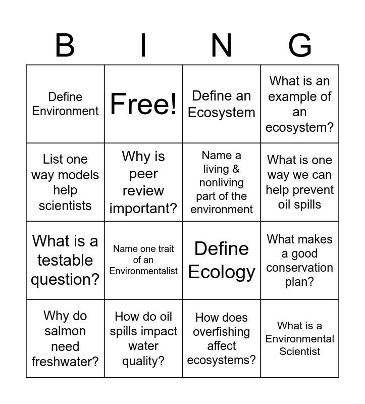 This bingo card has 19 words: Define Ecology, Name 3 steps of the Scientific Method, Define an Ecosystem, What is a Environmental Scientist, What makes a good conservation plan?, List one way models help scientists, How does overfishing affect ecosystems?, Define Environment, Free!, What is a testable question?, Name one trait of an Environmentalist, Why is peer review important?, Name a living & nonliving part of the environment, How do oil spills impact water quality?, Why do salmon need freshwater?, What is systems thinking?, What is an example of an ecosystem?, What is one way we can help prevent oil spills and What is one way we can clean oil spills.
