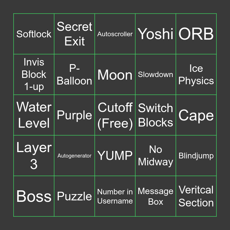 This bingo card has a free space and 24 words: Autogenerator, Puzzle, Moon, Boss, ORB, Softlock, Invis Block 1-up, Secret Exit, Switch Blocks, YUMP, Slowdown, Water Level, No Midway, Blindjump, P-Balloon, Message Box, Cape, Autoscroller, Ice Physics, Purple, Veritcal Section, Layer 3, Yoshi and Number in Username.