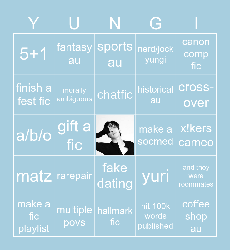This bingo card has a free space and 24 words: rarepair, multiple povs, chatfic, make a fic playlist, canon comp fic, 5+1, finish a fest fic, fantasy au, make a socmed, fake dating, historical au, a/b/o, yuri, and they were roommates, morally ambiguous, hit 100k words published, x!kers cameo, sports au, cross-over, gift a fic, coffee shop au, matz, nerd/jock yungi and hallmark fic.