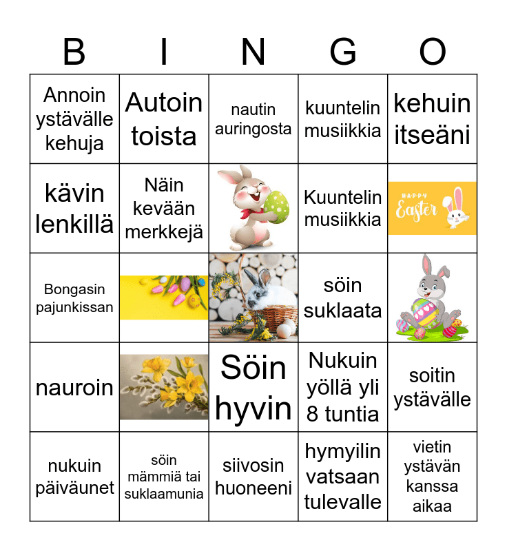 This bingo card has 5 images, a free space and 19 words: söin mämmiä tai suklaamunia, nukuin päiväunet, kehuin itseäni, Annoin ystävälle kehuja, kävin lenkillä, Autoin toista, söin suklaata, Söin hyvin, Kuuntelin musiikkia, Bongasin pajunkissan, Nukuin yöllä yli 8 tuntia, soitin ystävälle, Näin kevään merkkejä, hymyilin vatsaan tulevalle, nautin auringosta, vietin ystävän kanssa aikaa, nauroin, kuuntelin musiikkia and siivosin huoneeni.