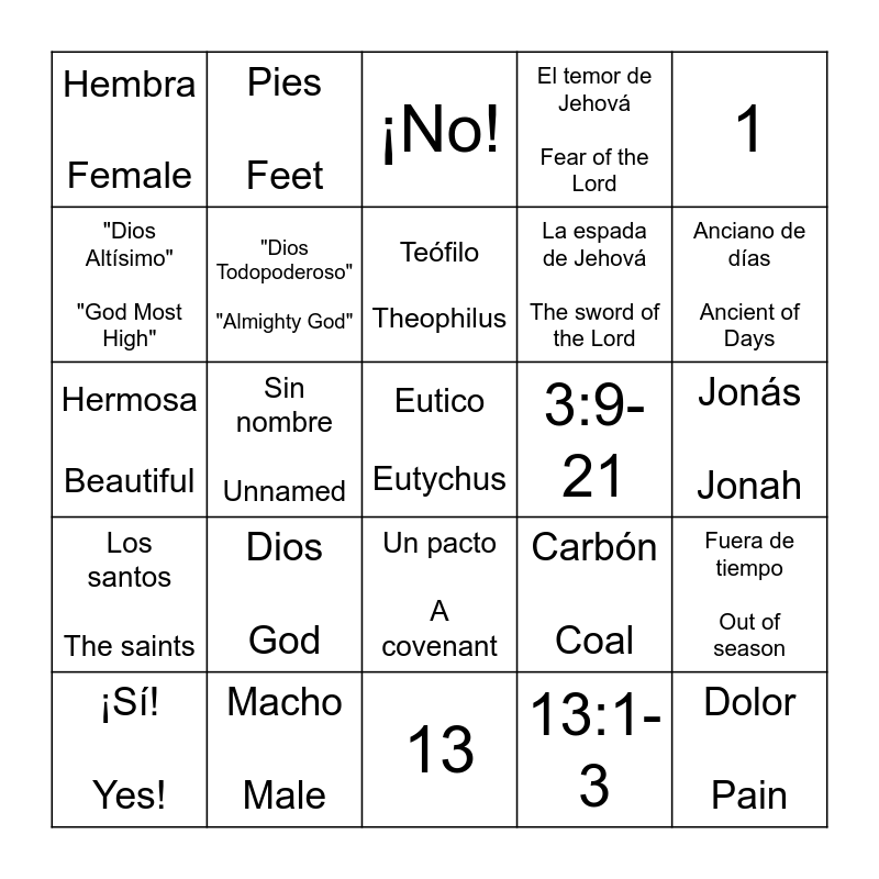 This bingo card has 35 words: Porque para siempre es su miserdicordia For His mercy endures forever, Cuervo Raven, Ur de los caldeos Ur of the Chaldeans, "Dios Todopoderoso" "Almighty God", Un pacto A covenant, El temor de Jehová Fear of the Lord, "Dios Altísimo" "God Most High", Abadón/Apolión Abaddon/Apollyon, Teófilo Theophilus, Samaria, Hermosa Beautiful, 1, Jesus, Habacuc Habakkuk, Hembra Female, 3:9-21, 13:1-3, Sin nombre Unnamed, Los santos The saints, Eutico Eutychus, Carbón Coal, ¡Sí! Yes!, Fuera de tiempo Out of season, Macho Male, ¡No!, Anciano de días Ancient of Days, Dolor Pain, Ciudad de la Verdad City of Truth, La espada de Jehová The sword of the Lord, Jonás Jonah, 5, 13, Dios God, Pies Feet and Malaquías Malachi.
