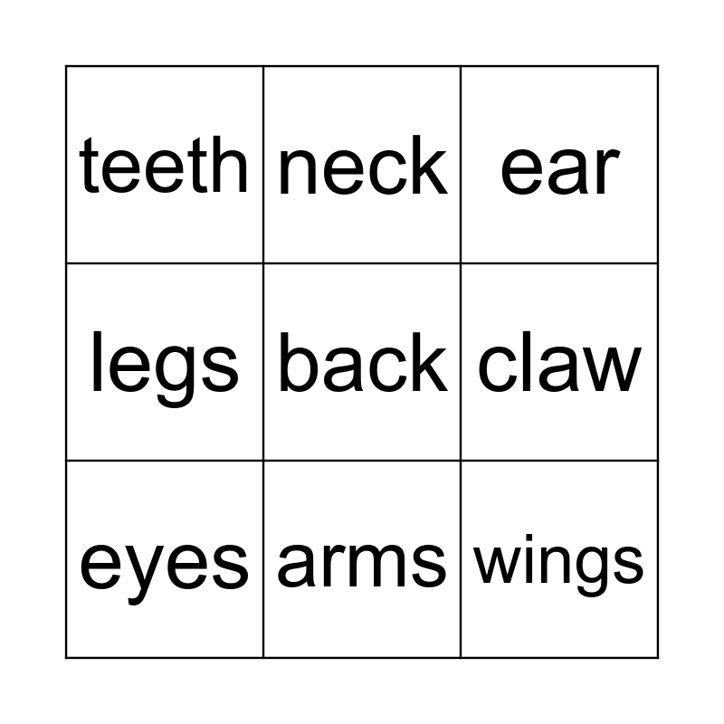 This bingo card has 15 words: tongue, scales, ear, teeth, arms, back, head, sides, claw, wings, snout, legs, eyes, neck and mouth.