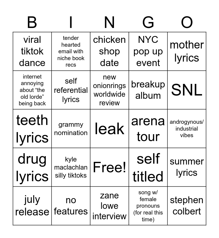 This bingo card has 26 words: Free!, song w/ female pronouns (for real this time), new onionrings worldwide review, no features, mother lyrics, viral tiktok dance, internet annoying about “the old lorde” being back, tender hearted email with niche book recs, androgynous/ industrial vibes, self titled, breakup album, teeth lyrics, summer lyrics, july release, grammy nomination, jack antonoff discourse, NYC pop up event, drug lyrics, chicken shop date, leak, SNL, zane lowe interview, arena tour, kyle maclachlan silly tiktoks, self referential lyrics and stephen colbert.