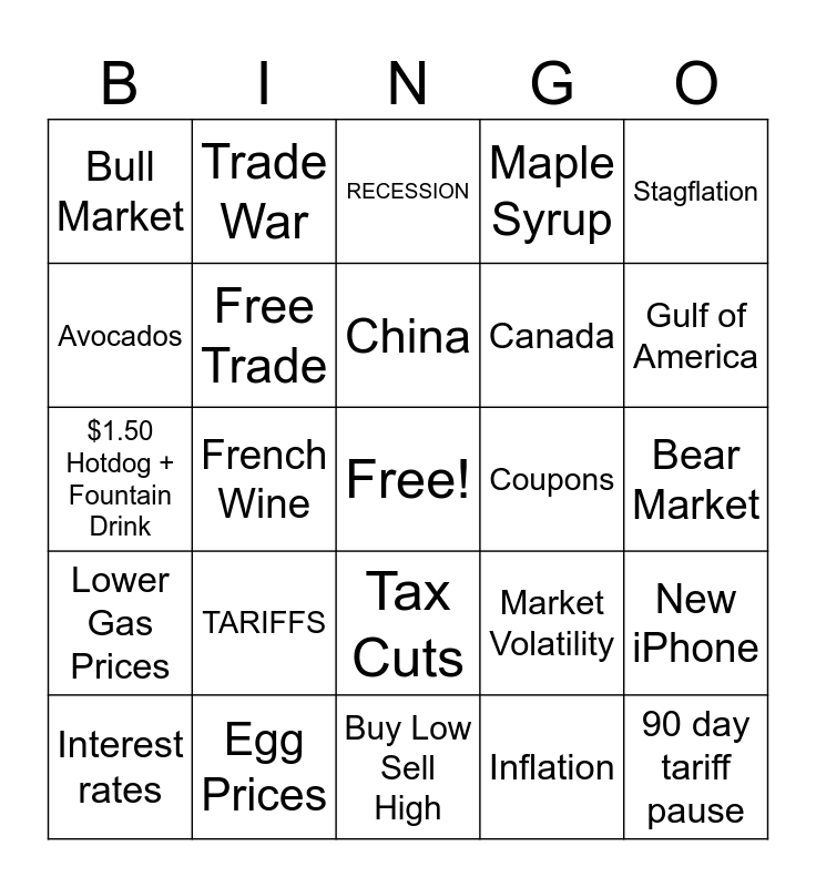 This bingo card has a free space and 24 words: TARIFFS, Egg Prices, China, Interest rates, Stagflation, Bull Market, Avocados, Trade War, Coupons, Tax Cuts, Canada, $1.50 Hotdog + Fountain Drink, Market Volatility, New iPhone, Free Trade, Inflation, Bear Market, RECESSION, Gulf of America, French Wine, 90 day tariff pause, Lower Gas Prices, Maple Syrup and Buy Low Sell High.