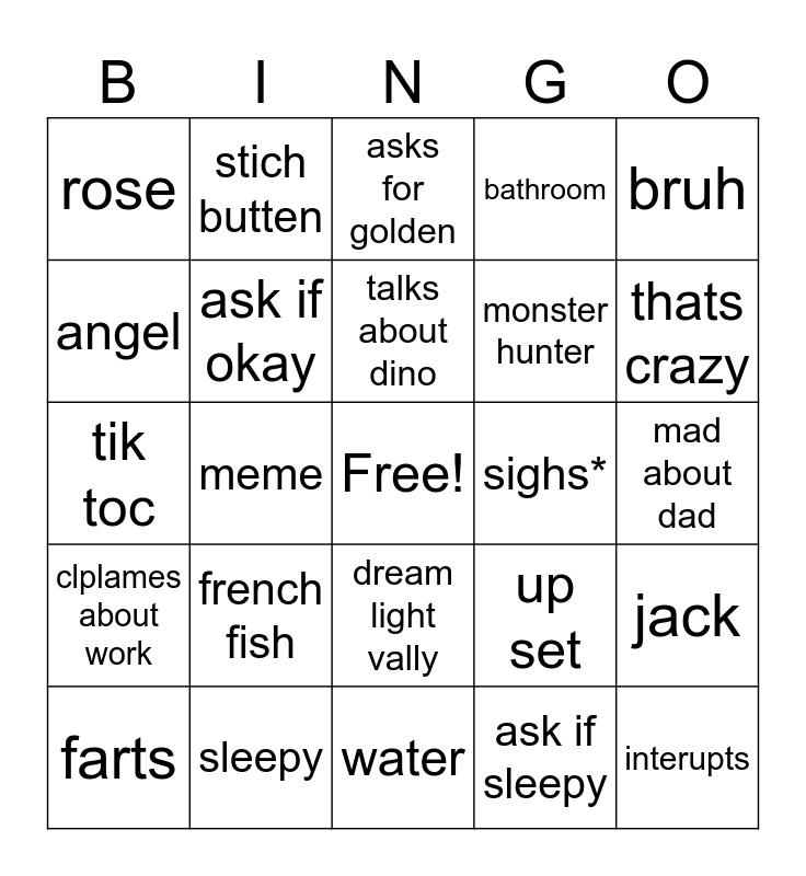 This bingo card has a free space and 24 words: french fish, sleepy, talks about dino, farts, bruh, rose, angel, stich butten, sighs*, dream light vally, monster hunter, tik toc, up set, jack, ask if okay, ask if sleepy, mad about dad, asks for golden, thats crazy, meme, interupts, clplames about work, bathroom and water.