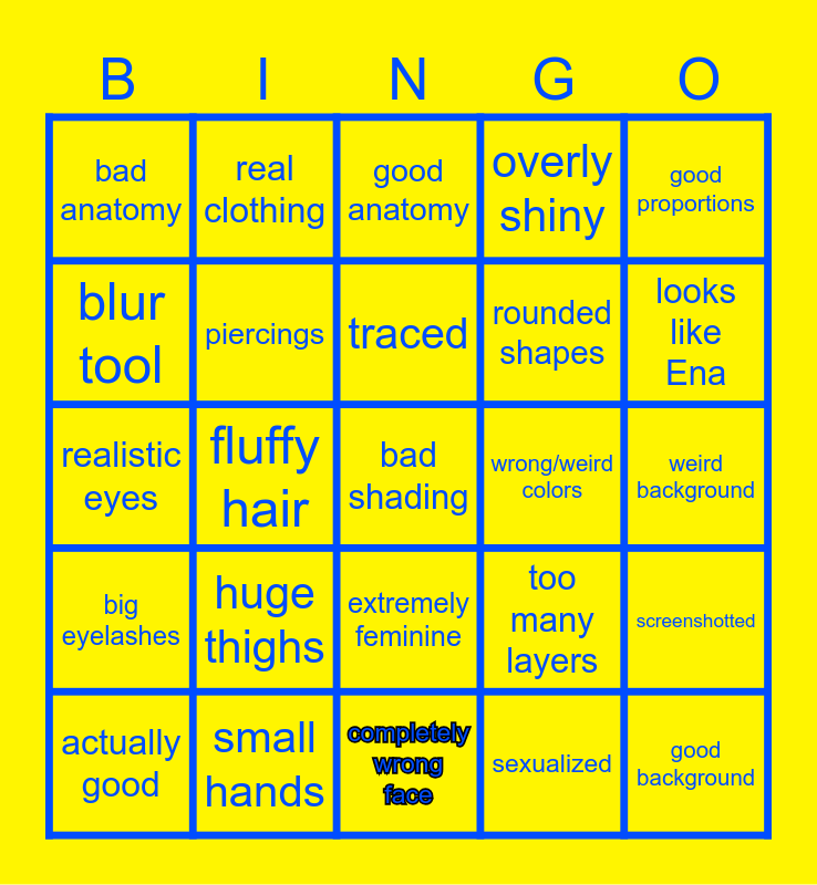 This bingo card has a free space and 24 words: huge thighs, small hands, traced, actually good, good proportions, bad anatomy, blur tool, real clothing, wrong/weird colors, extremely feminine, rounded shapes, realistic eyes, too many layers, screenshotted, piercings, sexualized, weird background, good anatomy, looks like Ena, fluffy hair, good background, big eyelashes, overly shiny and completely wrong face.