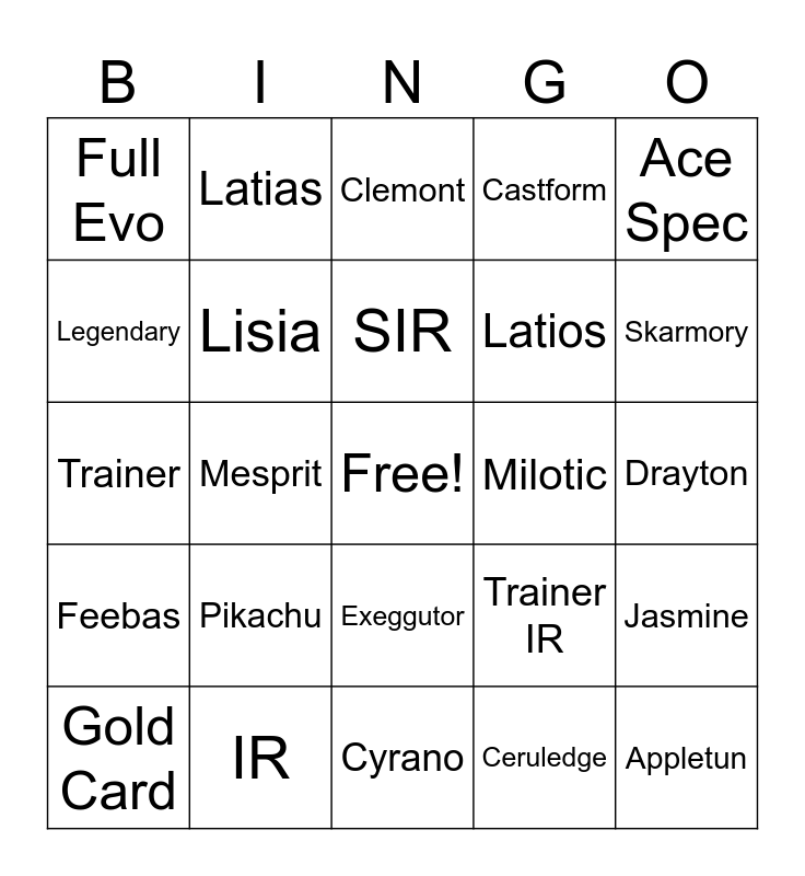 This bingo card has a free space and 24 words: Pikachu, IR, SIR, Gold Card, Ace Spec, Full Evo, Legendary, Latias, Milotic, Exeggutor, Latios, Trainer, Trainer IR, Jasmine, Lisia, Ceruledge, Drayton, Clemont, Skarmory, Mesprit, Appletun, Feebas, Castform and Cyrano.