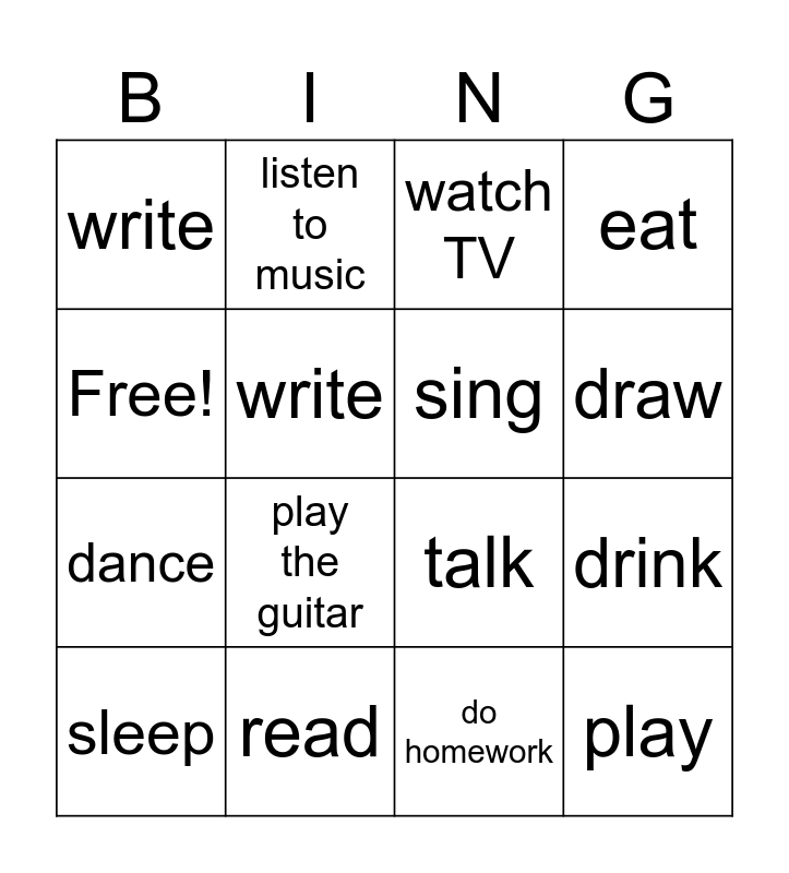 This bingo card has 16 words: read, drink, watch TV, write, dance, listen to music, talk, do homework, Free!, write, sleep, eat, play the guitar, draw, sing and play.