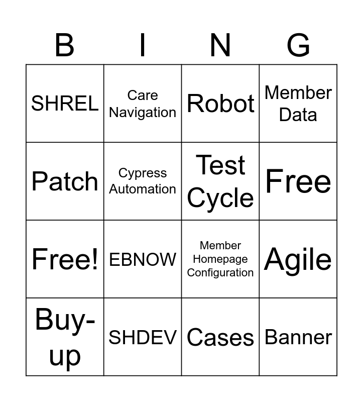 This bingo card has 20 words: Agile, Scrum, Robot, Tests, Buy-up, Patch, SHDEV, SHREL, Free!, Care Navigation, EBNOW, Member Homepage Configuration, Cypress Automation, Banner, Test Cycle, Pull Request, Free, Member Data, Cases and Refactoring.