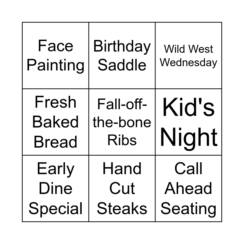 This bingo card has a free space and 8 words: Kid's Night, Wild West Wednesday, Birthday Saddle, Early Dine Special, Face Painting, Call Ahead Seating, Fresh Baked Bread and Hand Cut Steaks.