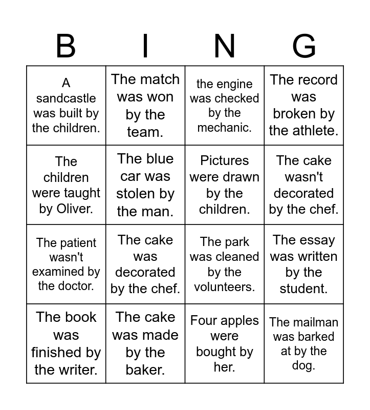 This bingo card has 16 words: The cake was made by the baker., The essay was written by the student., the engine was checked by the mechanic., A sandcastle was built by the children., The patient wasn't examined by the doctor., The match was won by the team., The park was cleaned by the volunteers., Four apples were bought by her., The children were taught by Oliver., The blue car was stolen by the man., The book was finished by the writer., The record was broken by the athlete., The cake was decorated by the chef., The cake wasn't decorated by the chef., Pictures were drawn by the children. and The mailman was barked at by the dog..