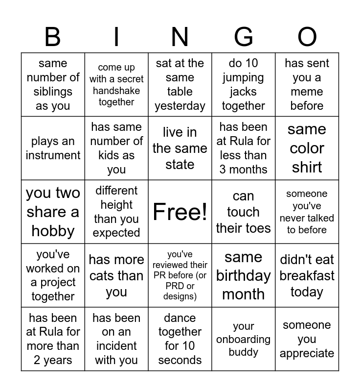 This bingo card has a free space and 24 words: has more cats than you, has been on an incident with you, live in the same state, has been at Rula for more than 2 years, has sent you a meme before, same number of siblings as you, plays an instrument, come up with a secret handshake together, can touch their toes, you've reviewed their PR before (or PRD or designs), has been at Rula for less than 3 months, you two share a hobby, same birthday month, didn't eat breakfast today, has same number of kids as you, your onboarding buddy, someone you've never talked to before, sat at the same table yesterday, same color shirt, different height than you expected, someone you appreciate, you've worked on a project together, do 10 jumping jacks together and dance together for 10 seconds.