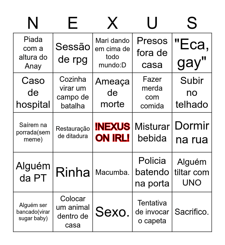 This bingo card has a free space and 27 words: Policia batendo na porta, Pessoa perdida, Fazer merda com comida, Sexo., Caso de hospital, Mari dando em cima de todo mundo:D, Sessão de rpg, Alguém da PT, Misturar bebida, Alguém tiltar com UNO, Saírem na porrada(sem meme), Presos fora de casa, Alguém ser bancado(virar sugar baby), Colocar um animal dentro de casa, Subir no telhado, Divisão de tarefas, Cozinha virar um campo de batalha, Ameaça de morte, Rinha, Piada com a altura do Anay, Dormir na rua, Tentativa de invocar o capeta, Restauração de ditadura, Sacrifico., Macumba., "Eca, gay" and Pintar um pinto na cara de alguém enquanto dorme.