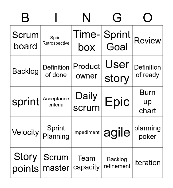 This bingo card has a free space and 24 words: Sprint Planning, Scrum master, Product owner, Story points, Review, Scrum board, Backlog, Sprint Retrospective, Epic, impediment, User story, sprint, agile, planning poker, Definition of done, Backlog refinement, Burn up chart, Time-box, Definition of ready, Acceptance criteria, iteration, Velocity, Sprint Goal and Team capacity.