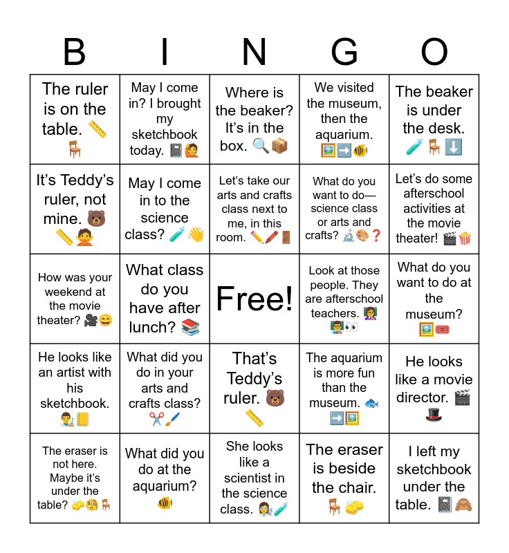 This bingo card has a free space and 30 words: What did you do at the aquarium? π , How was your weekend at the amusement park? π’π, What class do you have after lunch? π, Letβs do some afterschool activities in the arts and crafts class! π¨βοΈ, The ruler is on the table. ππͺ, Where is the beaker? Itβs in the box. ππ¦, May I come in to the science class? π§ͺπ, Thatβs Teddyβs ruler. π»π, Look at those people. They are afterschool teachers. π©βπ«π¨βπ«π, She looks like a scientist in the science class. π©βπ¬π§ͺ, What do you want to do at the museum? πΌοΈποΈ, I left my sketchbook under the table. ππ, The eraser is beside the chair. πͺπ§½, Thatβs not my ruler. Whose ruler is it? π€π, Letβs do some afterschool activities at the movie theater! π¬πΏ, Next to me, there is a big box. π¦π, The aquarium is more fun than the museum. πβ‘οΈπΌοΈ, He looks like an artist with his sketchbook. π¨βπ¨π, What did you do in your arts and crafts class? βοΈποΈ, The beaker is under the desk. π§ͺπͺβ¬οΈ, How was your weekend at the movie theater? π₯π, I saw my science teacher beside the chair. π§ͺπ©βπ«πͺ, May I come in? I brought my sketchbook today. ππ, What do you want to doβscience class or arts and crafts? π¬π¨β, Itβs Teddyβs ruler, not mine. π»ππ , We visited the museum, then the aquarium. πΌοΈβ‘οΈπ , He looks like a movie director. π¬π©, The eraser is not here. Maybe itβs under the table? π§½π§πͺ, Letβs take our arts and crafts class next to me, in this room. βοΈποΈπͺ and Look at those people. One looks like a teacher, and the other looks like a painter. ππ©βπ«π¨.