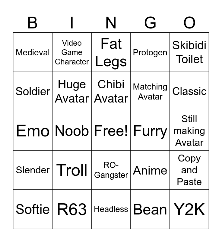 This bingo card has a free space and 24 words: Troll, R63, Chibi Avatar, Softie, Skibidi Toilet, Medieval, Soldier, Video Game Character, Furry, RO-Gangster, Matching Avatar, Emo, Anime, Copy and Paste, Huge Avatar, Bean, Still making Avatar, Fat Legs, Classic, Noob, Y2K, Slender, Protogen and Headless.