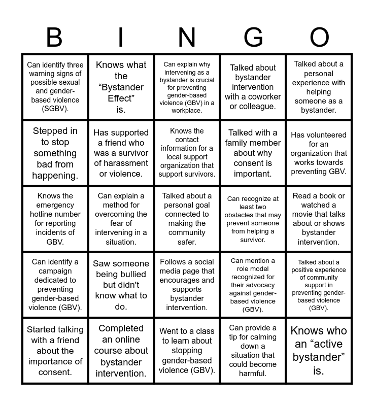 This bingo card has 25 words: Saw someone being bullied but didn't know what to do., Went to a class to learn about stopping gender-based violence (GBV)., Knows the contact information for a local support organization that support survivors., Started talking with a friend about the importance of consent., Talked about a personal experience with helping someone as a bystander., Can identify three warning signs of possible sexual and gender-based violence (SGBV)., Stepped in to stop something bad from happening., Knows what the “Bystander Effect” is., Can recognize at least two obstacles that may prevent someone from helping a survivor., Follows a social media page that encourages and supports bystander intervention., Talked with a family member about why consent is important., Knows the emergency hotline number for reporting incidents of GBV., Can mention a role model recognized for their advocacy against gender-based violence (GBV)., Talked about a positive experience of community support in preventing gender-based violence (GBV)., Has supported a friend who was a survivor of harassment or violence., Knows who an “active bystander” is., Read a book or watched a movie that talks about or shows bystander intervention., Can explain why intervening as a bystander is crucial for preventing gender-based violence (GBV) in a workplace., Has volunteered for an organization that works towards preventing GBV., Can explain a method for overcoming the fear of intervening in a situation., Talked about a personal goal connected to making the community safer., Completed an online course about bystander intervention., Can identify a campaign dedicated to preventing gender-based violence (GBV)., Talked about bystander intervention with a coworker or colleague. and Can provide a tip for calming down a situation that could become harmful..
