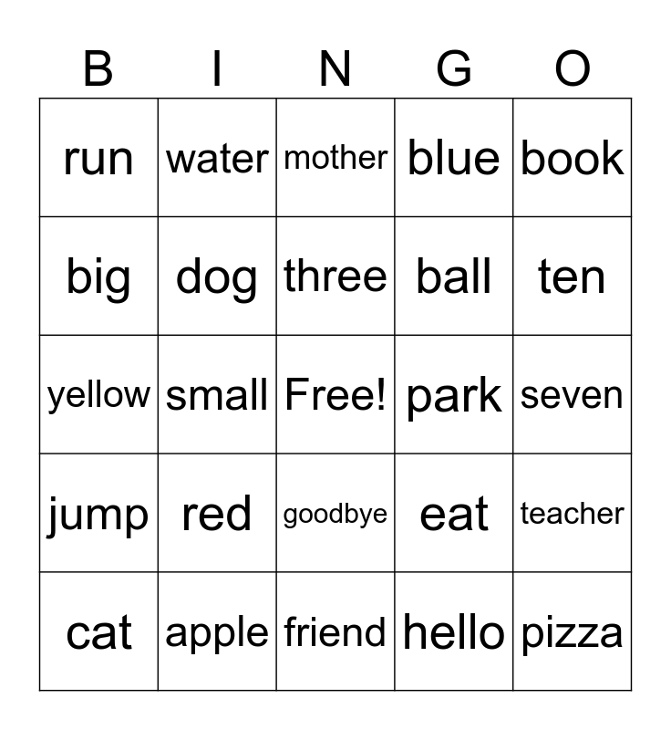 This bingo card has a free space and 24 words: cat, red, three, hello, book, run, water, mother, park, seven, yellow, dog, eat, teacher, big, apple, friend, blue, ten, jump, small, goodbye, ball and pizza.