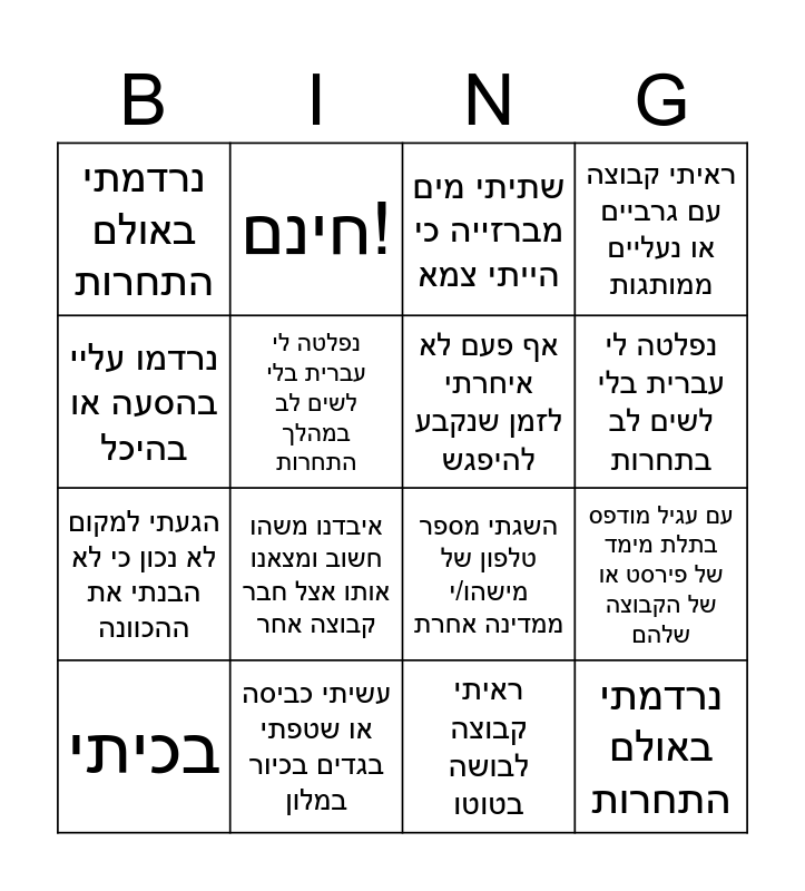This bingo card has 23 words: נרדמתי באולם התחרות, איבדתי את הקול, נפלטה לי עברית בלי לשים לב בתחרות, הלכתי לאיבוד באולם, נרדמו עליי בהסעה או בהיכל, נרדמתי באולם התחרות, נפלטה לי עברית בלי לשים לב במהלך התחרות, חינם!, בכיתי, נרדמו עליי בתחרות, איבדנו משהו חשוב ומצאנו אותו אצל חבר קבוצה אחר, הגעתי למקום לא נכון כי לא הבנתי את ההכוונה, דיברתי עם מישהו חשוב בלי לדעת שזה הוא/היא, נאלצתי להסביר משהו בלי לדעת את המילים הנכונות (או עם פנטומימה), עשיתי כביסה או שטפתי בגדים בכיור במלון, אכלתי משהו שלא זיהיתי בכלל, שתיתי מים מברזייה כי הייתי צמא, השגתי מספר טלפון של מישהו/י ממדינה אחרת, אף פעם לא איחרתי לזמן שנקבע להיפגש, עם עגיל מודפס בתלת מימד של פירסט או של הקבוצה שלהם, ראיתי קבוצה עם גרביים או נעליים ממותגות, ראיתי קבוצה לבושה בטוטו and יויו נגע בי במהלך התחרות.