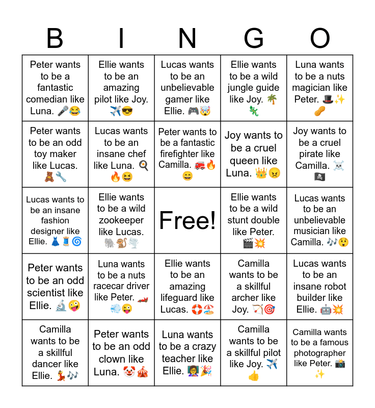 This bingo card has a free space and 33 words: Luna wants to be a crazy artist like Camilla. ๐จ๐, Camilla wants to be a famous singer like Joy. ๐ค๐, Ellie wants to be a wild zookeeper like Lucas. ๐๐๐ช๏ธ, Joy wants to be a cruel villain like Peter. ๐ฆน๐, Peter wants to be an odd scientist like Ellie. ๐ฌ๐คช, Lucas wants to be an insane chef like Luna. ๐ณ๐ฅ๐, Luna wants to be a nuts magician like Peter. ๐ฉโจ๐ฅ, Camilla wants to be a skillful dancer like Ellie. ๐๐ถ, Ellie wants to be an amazing pilot like Joy. โ๏ธ๐, Joy wants to be an awesome doctor like Luna. ๐ฉบ๐ซ, Peter wants to be a fantastic firefighter like Camilla. ๐๐ฅ๐, Lucas wants to be an unbelievable gamer like Ellie. ๐ฎ๐คฏ, Luna wants to be a crazy baker like Joy. ๐ง๐, Camilla wants to be a famous explorer like Lucas. ๐บ๏ธ๐๏ธ, Ellie wants to be a wild stunt double like Peter. ๐ฌ๐ฅ, Joy wants to be a cruel pirate like Camilla. โ ๏ธ๐ดโโ ๏ธ, Peter wants to be an odd clown like Luna. ๐คก๐ช, Lucas wants to be an insane fashion designer like Ellie. ๐๐งต๐, Luna wants to be a nuts racecar driver like Peter. ๐๏ธ๐จ๐, Camilla wants to be a skillful archer like Joy. ๐น๐ฏ, Ellie wants to be an amazing lifeguard like Lucas. ๐๐๏ธ, Joy wants to be an awesome astronaut like Peter. ๐๐, Peter wants to be a fantastic comedian like Luna. ๐ค๐, Lucas wants to be an unbelievable musician like Camilla. ๐ถ๐ฒ, Luna wants to be a crazy teacher like Ellie. ๐ฉโ๐ซ๐, Camilla wants to be a famous photographer like Peter. ๐ธโจ, Ellie wants to be a wild jungle guide like Joy. ๐ด๐ฆ, Joy wants to be a cruel queen like Luna. ๐๐ , Peter wants to be an odd toy maker like Lucas. ๐งธ๐ง, Lucas wants to be an insane robot builder like Ellie. ๐ค๐ฅ, Luna wants to be a nuts detective like Camilla. ๐ต๏ธโโ๏ธ๐, Camilla wants to be a skillful pilot like Joy. โ๏ธ๐ and Ellie wants to be an amazing vet like Luna. ๐ถ๐ฉโโ๏ธ.