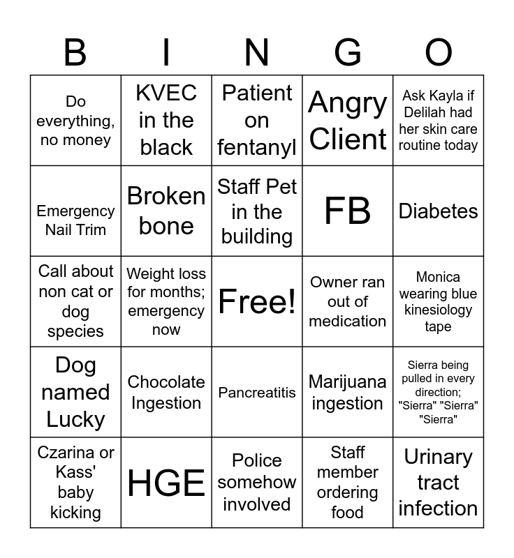 This bingo card has a free space and 24 words: Chocolate Ingestion, HGE, Staff Pet in the building, Czarina or Kass' baby kicking, Ask Kayla if Delilah had her skin care routine today, Do everything, no money, Emergency Nail Trim, KVEC in the black, Owner ran out of medication, Pancreatitis, FB, Call about non cat or dog species, Marijuana ingestion, Sierra being pulled in every direction; "Sierra" "Sierra" "Sierra", Broken bone, Staff member ordering food, Monica wearing blue kinesiology tape, Patient on fentanyl, Diabetes, Weight loss for months; emergency now, Urinary tract infection, Dog named Lucky, Angry Client and Police somehow involved.