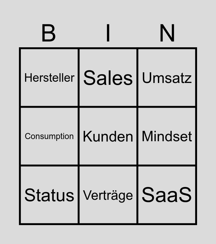 This bingo card has 9 words: Status, Umsatz, Sales, Consumption, Hersteller, Mindset, Kunden, SaaS and Verträge.