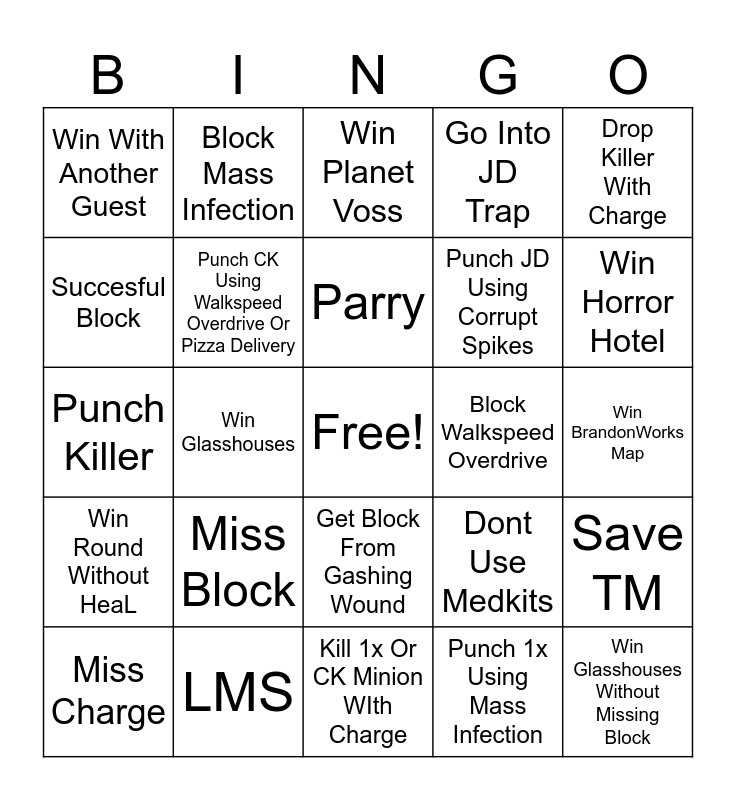 This bingo card has a free space and 24 words: Miss Block, LMS, Parry, Miss Charge, Drop Killer With Charge, Win With Another Guest, Succesful Block, Block Mass Infection, Block Walkspeed Overdrive, Get Block From Gashing Wound, Punch JD Using Corrupt Spikes, Punch Killer, Dont Use Medkits, Save TM, Punch CK Using Walkspeed Overdrive Or Pizza Delivery, Punch 1x Using Mass Infection, Win BrandonWorks Map, Win Planet Voss, Win Horror Hotel, Win Glasshouses, Win Glasshouses Without Missing Block, Win Round Without HeaL, Go Into JD Trap and Kill 1x Or CK Minion WIth Charge.