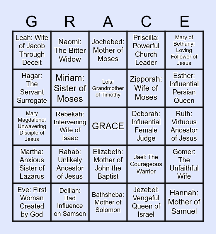 This bingo card has a free space and 29 words: Eve: First Woman Created by God, Sarah: Mother of the Jewish Nation, Rebekah: Intervening Wife of Isaac, Rachel: Wife of Jacob and Mother of Joseph, Leah: Wife of Jacob Through Deceit, Jochebed: Mother of Moses, Miriam: Sister of Moses, Rahab: Unlikely Ancestor of Jesus, Deborah: Influential Female Judge, Delilah: Bad Influence on Samson, Ruth: Virtuous Ancestor of Jesus, Hannah: Mother of Samuel, Bathsheba: Mother of Solomon, Jezebel: Vengeful Queen of Israel, Esther: Influential Persian Queen, Mary: Obedient Mother of Jesus, Elizabeth: Mother of John the Baptist, Martha: Anxious Sister of Lazarus, Mary of Bethany: Loving Follower of Jesus, Mary Magdalene: Unwavering Disciple of Jesus, Jael: The Courageous Warrior, Abigail: Wise and Determined, Zipporah: Wife of Moses, Hagar: The Servant Surrogate, Priscilla: Powerful Church Leader, Naomi: The Bitter Widow, Gomer: The Unfaithful Wife, Lois: Grandmother of Timothy and Tamar: Daughter of David.