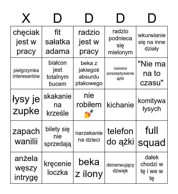 This bingo card has 30 words: kręcenie loczka, agresywne zamknięcie okna, skakanie na krześle, syk, chęciak jest w pracy, radzio jest w pracy, białcon jest totalnym bucem, narzekanie na dzieci, kichanie, beka z ilony, komitywa łysych, nie robiłem 💅, denerwujący dźwięk, dałek chodzi w tę i we w tę, "Nie ma na to czasu", ktoś się spóźnia, telefon do ążki, zapach wanilii, bilety się nie sprzedają, wkurwianie się na inne działy, łysy je zupke, ola prawi farmazony, fit sałatka adama, mimimi poszeptywanie ążki, pielgrzymka interesantów, radzio podnieca się mielonym, full squad, anżela węszy intrygę, beka z jakiegoś absurdu ptakowego and prawienie przez kogoś mądrości.