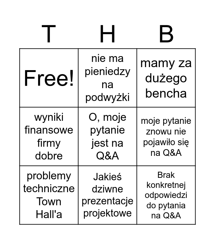 This bingo card has 9 words: problemy techniczne Town Hall'a, mamy za dużego bencha, nie ma pieniedzy na podwyżki, wyniki finansowe firmy dobre, Free!, moje pytanie znowu nie pojawiło się na Q&A, O, moje pytanie jest na Q&A, Brak konkretnej odpowiedzi do pytania na Q&A and Jakieś dziwne prezentacje projektowe.