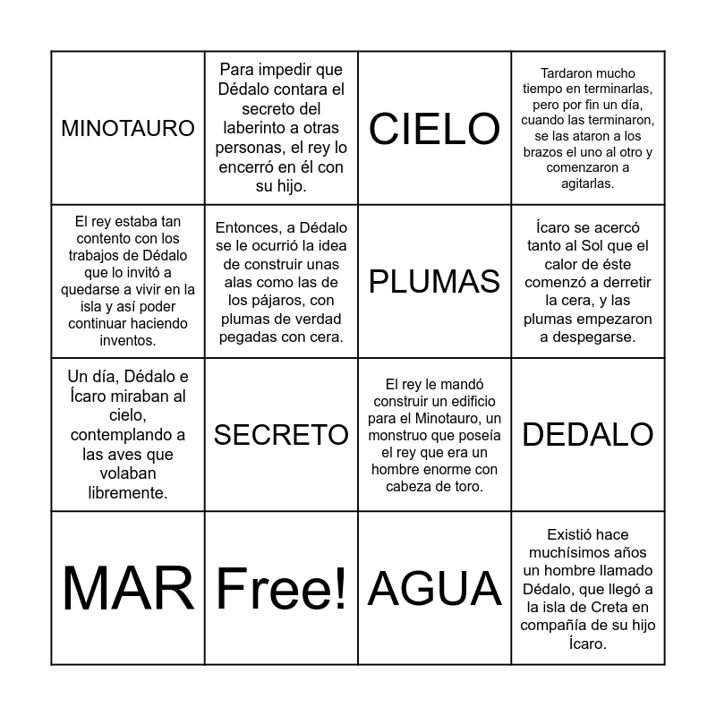 This bingo card has 30 words: CRETA, HIJO, DEDALO, REY, MINOTAURO, CIELO, PLUMAS, BRAZOS, Free!, AIRE, AGUA, MAR, FELIZ, LABERINTO, SECRETO, SOL, DÉDALO E ÍCARO, Existió hace muchísimos años un hombre llamado Dédalo, que llegó a la isla de Creta en compañía de su hijo Ícaro., Dédalo era un gran inventor. Por eso, el rey de Creta le encargó unos cuantos trabajos. Entre ellos, unas estatuas maravillosas que podían hablar y moverse., El rey estaba tan contento con los trabajos de Dédalo que lo invitó a quedarse a vivir en la isla y así poder continuar haciendo inventos., El rey le mandó construir un edificio para el Minotauro, un monstruo que poseía el rey que era un hombre enorme con cabeza de toro., Dédalo construyó un enorme laberinto del que era imposible salir., Para impedir que Dédalo contara el secreto del laberinto a otras personas, el rey lo encerró en él con su hijo., Un día, Dédalo e Ícaro miraban al cielo, contemplando a las aves que volaban libremente., Entonces, a Dédalo se le ocurrió la idea de construir unas alas como las de los pájaros, con plumas de verdad pegadas con cera., Tardaron mucho tiempo en terminarlas, pero por fin un día, cuando las terminaron, se las ataron a los brazos el uno al otro y comenzaron a agitarlas., Empezaron a elevarse poco a poco, volando cada vez más altos y más contentos., Dédalo, al ver la altura que habían alcanzado, advirtió a su hijo para que no se elevase más, pero Ícaro, feliz, subía y subía por el cielo azul., Ícaro se acercó tanto al Sol que el calor de éste comenzó a derretir la cera, y las plumas empezaron a despegarse. and Sin alas, Ícaro no pudo sostenerse en el aire y su vuelo terminó sobre las agua del mar, donde se ahogó..