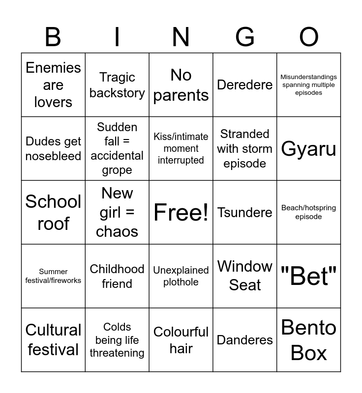 This bingo card has a free space and 24 words: Childhood friend, Colds being life threatening, Kiss/intimate moment interrupted, Cultural festival, Misunderstandings spanning multiple episodes, Enemies are lovers, Dudes get nosebleed, Tragic backstory, Tsundere, Unexplained plothole, Stranded with storm episode, School roof, Window Seat, "Bet", Sudden fall = accidental grope, Danderes, Beach/hotspring episode, No parents, Gyaru, New girl = chaos, Bento Box, Summer festival/fireworks, Deredere and Colourful hair.