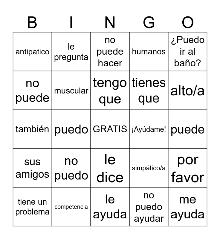 This bingo card has a free space and 27 words: simpático/a, el torre, tienes que, le ayuda, no puede, no puede hacer, le pregunta, sus amigos, ¡Ayúdame!, por favor, también, humanos, tiene un problema, competencia, alto/a, pequeño/a, muscular, tengo que, no puedo, antipatico, puede, no puedo ayudar, puedo, me ayuda, le dice, ¿Puedo ir al baño? and No puedo.