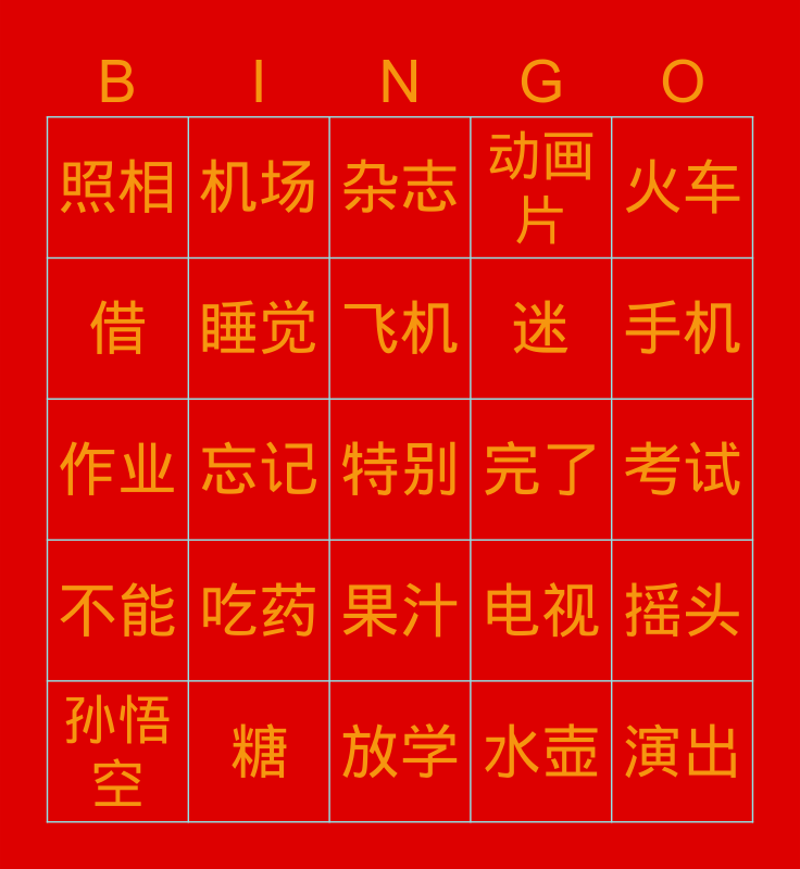This bingo card has a free space and 27 words: 电视, 卡通, 迷, 放学, 借, 杂志, 机场, 不能, 完了, 摇头, 作业, 动画片, 孙悟空, 糖, 手机, 洗澡, 睡觉, 飞机, 吃药, 照相, 考试, 水壶, 忘记, 演出, 果汁, 火车 and 开会.