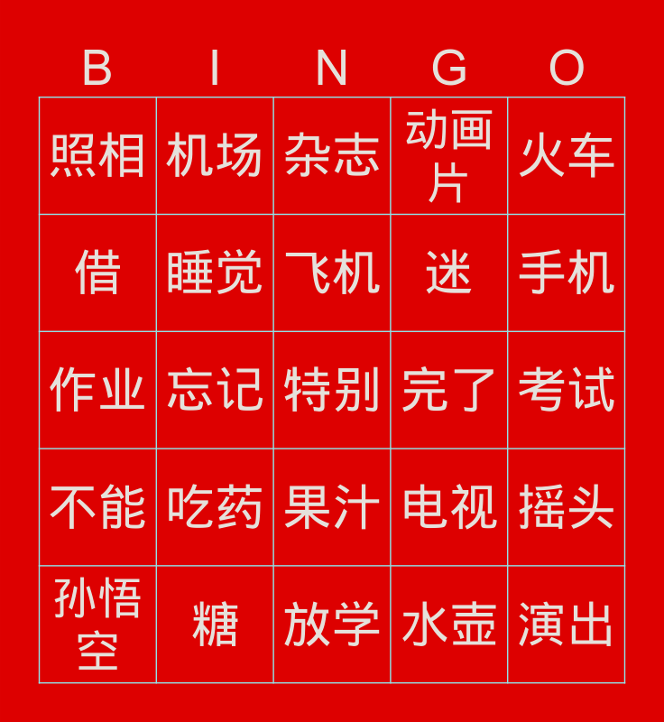 This bingo card has a free space and 27 words: 电视, 卡通, 迷, 放学, 借, 杂志, 机场, 不能, 完了, 摇头, 作业, 动画片, 孙悟空, 糖, 手机, 洗澡, 睡觉, 飞机, 吃药, 照相, 考试, 水壶, 忘记, 演出, 果汁, 火车 and 开会.