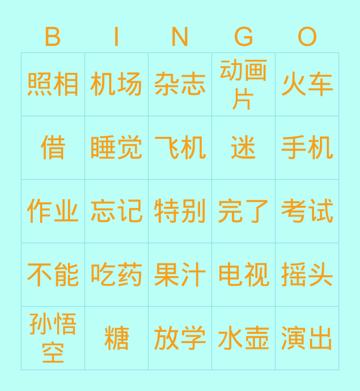 This bingo card has a free space and 27 words: 电视, 卡通, 迷, 放学, 借, 杂志, 机场, 不能, 完了, 摇头, 作业, 动画片, 孙悟空, 糖, 手机, 洗澡, 睡觉, 飞机, 吃药, 照相, 考试, 水壶, 忘记, 演出, 果汁, 火车 and 开会.