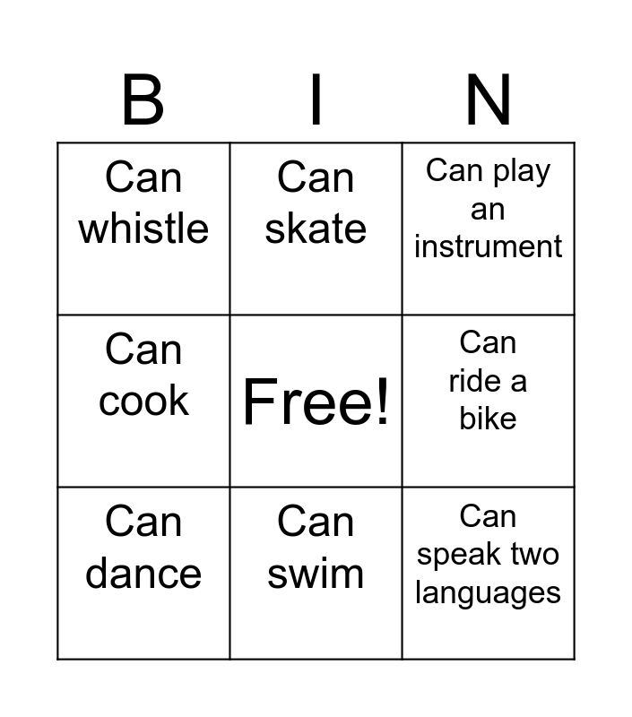 This bingo card has a free space and 11 words: Can hula hoop, Can do a cartwheel, Can ride a bike, Can dance, Can play an instrument, Can whistle, Can swim, Can play a sport, Can cook, Can skate and Can speak two languages.