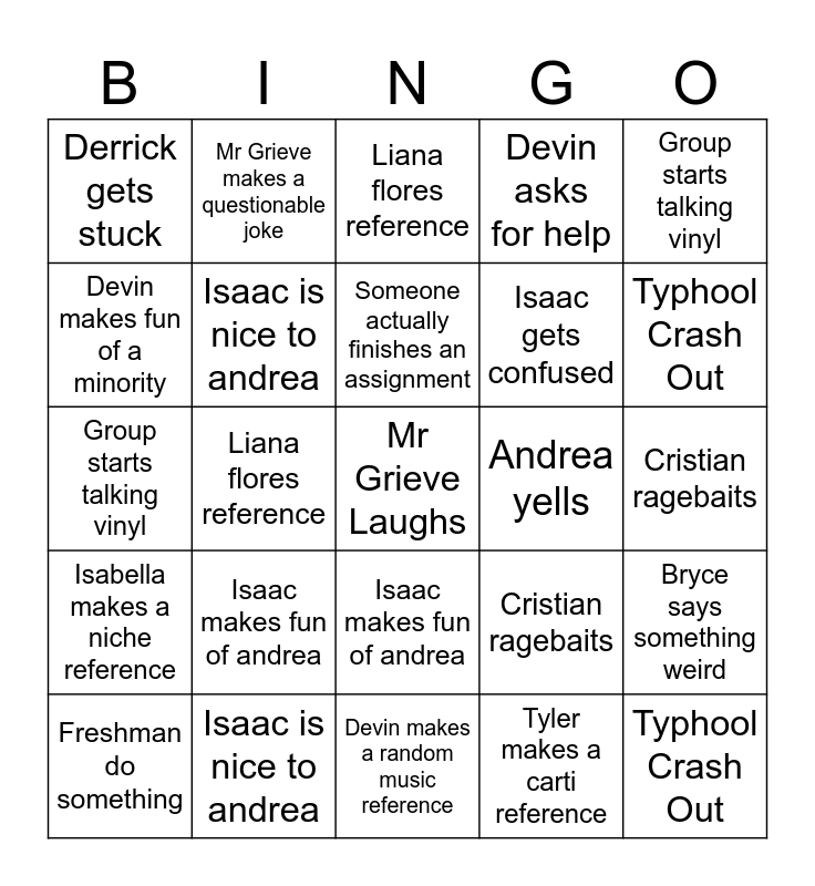 This bingo card has a free space and 49 words: Mr Perry appears, Typhool Crash Out, Freshman do something, Devin makes a random music reference, Isaac makes fun of andrea, Isabella makes a niche reference, Mr Grieve makes a questionable joke, Guest star appears, Devin makes fun of a minority, Cristian goes to another person's seat, Isaac is nice to andrea, Devin asks for help, Bryce says something weird, Cristian ragebaits, Musical reference, Long engineering line, Someone actually finishes an assignment, Andrea yells, Isaac gets angry, Group starts talking vinyl, Liana flores reference, Tyler makes a carti reference, Derrick gets stuck, Isaac gets confused, Mr Perry appears, Typhool Crash Out, Freshman do something, Devin makes a random music reference, Isaac makes fun of andrea, Isabella makes a niche reference, Mr Grieve makes a questionable joke, Guest star appears, Devin makes fun of a minority, Cristian goes to another person's seat, Isaac is nice to andrea, Devin asks for help, Mr Grieve Laughs, Bryce says something weird, Cristian ragebaits, Musical reference, Long engineering line, Someone actually finishes an assignment, Andrea yells, Isaac gets angry, Group starts talking vinyl, Liana flores reference, Tyler makes a carti reference, Derrick gets stuck and Isaac gets confused.