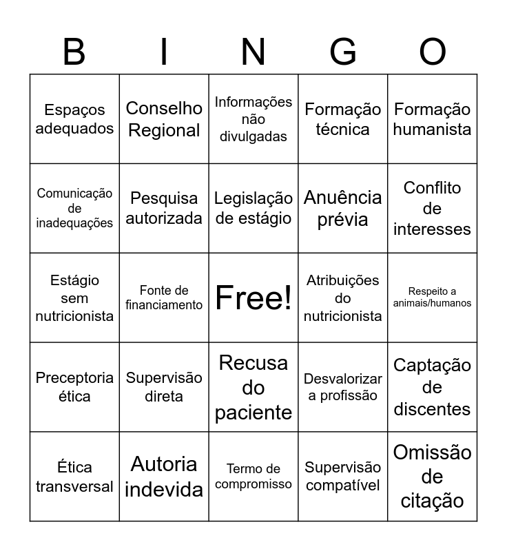 This bingo card has a free space and 25 words: Supervisão direta, Termo de compromisso, Legislação de estágio, Ética transversal, Formação humanista, Espaços adequados, Comunicação de inadequações, Conselho Regional, Atribuições do nutricionista, Recusa do paciente, Anuência prévia, Estágio sem nutricionista, Desvalorizar a profissão, Captação de discentes, Pesquisa autorizada, Comitê de Ética, Respeito a animais/humanos, Informações não divulgadas, Conflito de interesses, Fonte de financiamento, Omissão de citação, Autoria indevida, Preceptoria ética, Formação técnica and Supervisão compatível.