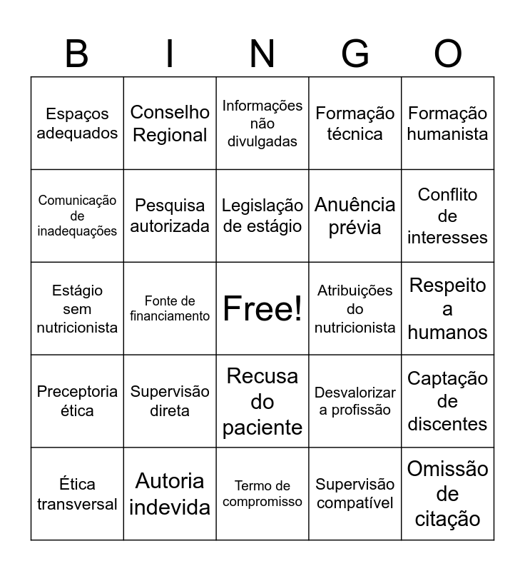 This bingo card has a free space and 25 words: Supervisão direta, Termo de compromisso, Legislação de estágio, Ética transversal, Formação humanista, Espaços adequados, Comunicação de inadequações, Conselho Regional, Atribuições do nutricionista, Recusa do paciente, Anuência prévia, Estágio sem nutricionista, Desvalorizar a profissão, Captação de discentes, Pesquisa autorizada, Comitê de Ética, Respeito a humanos, Informações não divulgadas, Conflito de interesses, Fonte de financiamento, Omissão de citação, Autoria indevida, Preceptoria ética, Formação técnica and Supervisão compatível.